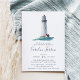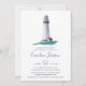 Elegant coastal baby shower invitations for little sailors on the way feature a watercolor illustration of a lighthouse in navy, red, and white on a teal sea, topping your baby shower details in chic nautical navy blue lettering.