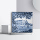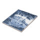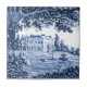 Victorian era home with landscape in blue drawing. Dog is running across lawn while victorian dressed couple sits at bench on lawn.