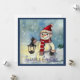 Original watercolor painting by Sandra Gale featuring a traditional jolly snow man standing in snowy woods holding a warm and glowing lantern. Perfect design for Christmas, or as an alternative, concentrating rather, on the magic of winter and the general holiday season.