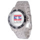 Has heft and feel of expensive stainless steel quartz watches. Good band with safety catch. I removed links, which is easy because engraved arrows show direction to push the linking pins. As always by this seller, the image (a railroad logo) is a perfect reproduction of my emailed image, and is precisely spaced and aligned.