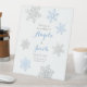 This is a great inexpensive wedding welcome pedestal sign for a wedding in the winter with a lapis blue and silver snowflake theme.