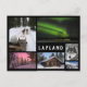 Collage postcard of various landscapes and icons of Lapland in winter, like husky safari, skiing, northern lights and log cabins with lots of snow with a black frame and the text: 'Lapland'. Great winter souvenir!