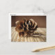 This postcard features a very simple still life composition of a single golden brown larch cone still attached to its branch on a straw mat against a chocolate brown background. The exquisite detail of this very small cone resembles a wooden rose. Lovely for Christmas and the holiday season.