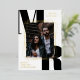 Modern typography save the date flat card with your photo in the middle, in a geometrical gold foil frame. Beneath, your initials in large bold black letters. Add names and additional information in elegant gold foil fonts. The back features chic broad stripes.