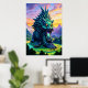 A large blue fantasy creature with four legs, tail, green fur and many sharp teeth in the mouth, forest and mountain in the background with a colourful sky. This is a AI generated art.