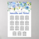 Beautiful blue hydrangeas create an elegant watercolor border at the top of this large 15-Table seating chart. A dash of purple hydrangeas give it depth and creamy white flowers keep it light and airy. Green, leaves and dangling vine, give it just a touch of Boho style. The wedding couple names are written in a bright blue trending script font. This blue floral seating chart is part of the Blue Hydrangea collection that contains signs, programs, menus, place cards and table decor that let you easily and affordably personalise your wedding ceremony and reception. You should see a link to it on this page. If you can' t find the link or need help with an item, please contact me.
