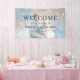 Modern photo welcome banner to a wedding personalised with your photo beneath a thin white transparent layer that will make the navy blue text and light blue initials pop.