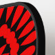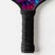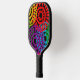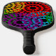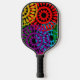 This pickleball paddle has a Black History design of large circles formed from raindrop shapes and circles in red, yellow, purple, green, and turquoise.