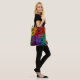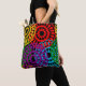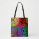This tote bag has a Black History design of large circles formed from raindrop shapes and circles in red, yellow, purple, green, and turquoise.