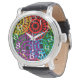 This men's watch has a Black History design of large circles formed from raindrop shapes and circles in red, yellow, purple, green, and turquoise.