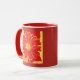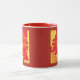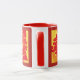 Coffee mug in a retro modern graphic image of a large daisy aster flower, in vivid red and golden yellow, against a red and saffron yellow background, and bordered in deep red