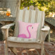 This fun and tropical outdoor cushion is decorated with a large pink flamingo on a coral background, making it the perfect summertime accessory for the beach house, patio, deck or pool area.