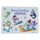 Incredibly detailed and colorful Christmas illustration of sledging snowgirls, skiing snowpeople and skating snowmen, plus band playing snowfolk, all set amidst a wonderfully snowy Winter Wonderland.