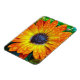 Featuring an up close and personal look at a golden yellow-orange flower with a subtle and striking blue centre surrounded by green leaf foliage underneath.