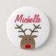 Large name reindeer buttons for Christmas party at home or office. Cute Rudolf deer cartoon design with red nose. Script typography template for names. Personalised name badge buttons for corporate Holiday party. Custom decoration for company Xmas celebration.