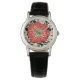 Watch in a large, red, camellia flower, in an Art Nouveau inspired style, with a floral background in beige on black