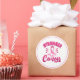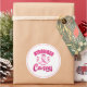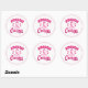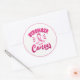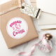 Sticker is shown in a large round shape with a pink ribbon print.
