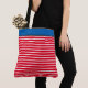 This tote bag is shown with a fun Red and White striped print design with a Marine Blue colour top panel. Large size shown. Has Black straps.