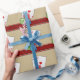 This gift wrapping paper has sets of cards showing blackjack with a stack of chips beside them. The background is tan with a border line that is red black and tan.