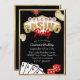 This custom invitation features a Casino party theme. An image of a four of a kind aces hand of playing cards is pictured in the bottom left, next to a pair of red glitter dice. Coins are falling around the text area in the centre. The classic Welcome to Las Vegas sign is printed at the top with Casino printed over it on a glamourous gold diamonds pattern.