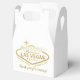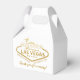 Personalised welcome to fabulous Las Vegas light sign in faux gold foil on a white gable box with custom wording on the back for creating a hangover helper welcome kit for guests at your destination wedding. The boxes are nice and small, perfect for holding some pain reliever, hydration powders, B vitamins, mints or gum, and a certificate or voucher for breakfast. The text can be changed entirely if you have a different use in mind, and several variations are available in the Paper Grape Destinations Zazzle designer store as well.