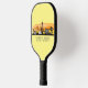 Stylish pickleball paddle features Las Vegas Nevada city skyline silhouette with sunset watercolor splash and latitude & longitude coordinates on pale yellow background.