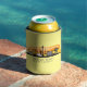 Can cooler features Las Vegas Nevada city skyline silhouette with sunset watercolor splash and latitude & longitude coordinates on pale yellow background.