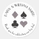 Faux silver glitter and black card suits are circled by customisable text making these round stickers perfect for all kinds of projects and occasions. Use them to label favours for wedding guests, to close envelopes and more.