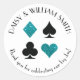 Faux teal glitter and black card suits are circled by customisable text making these round stickers perfect for all kinds of projects and occasions. Use them to label favours for wedding guests, to close envelopes and more.