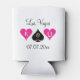 Las Vegas theme monogrammed wedding can coolers. Neon pink and black playing card suits design with name initials of bride and groom plus date of marriage. Elegant script typography. Cute poker theme beverage holder with stylish monogram. Also nice for cosy engagement or anniversary party. King and queens of hearts design.