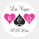 Las Vegas theme wedding favour stickers with monogram and date of marriage. Cute King and queen of hearts design with custom initials of bride and groom. Poker playing card suits in black and neon pink colours. Hearts and spade. Fun for wedding, engagement, anniversary, bridal shower, bachelorette party etc. Also handy as envelope seals / sealers.