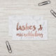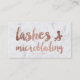 A modern, stylish lashes microblading, eyes makeup artist business card with modern hand lettering style brush typography in faux rose gold foil on a trendy and elegant white marble background.