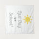 Stylish end of school year photo backdrop tapestry sign design features a "Last Day of School!" script quote typography text design in light grey and charcoal colours with yellow sunshine graphic and a white background colour.