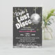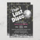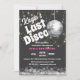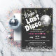 © Socialite Designs Inc. & LICENSORS. Celebrate a Disco Bachelorette party by inviting the guests with this retro last disco bachelorette party invitation. Colours are silver, white, pink and grey. The design incorporates a silver disco ball and gold / white string lights as a background.