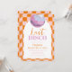 This bachelorette party invitation features a retro-inspired aesthetic with a playful twist and a vibrant chequered pattern in alternating orange and pink squares and gold details.