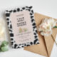Cowgil themed Bachelor Party Weekend Itinerary Invitation with cowhide pattern accents and boho western flowers in black and soft pink.
