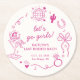 Let's go girls! Celebrate the bride-to-be with these trendy "Last Rodeo" Disco Cowgirl Bachelorette party paper coasters. Featuring Featuring a vibrant hot pink color palette, playful hand-drawn western illustration doodles (like horseshoes, cowboy boots, and cacti), and a shimmering disco ball, these coasters are perfect for adding a touch of retro glam to your party. Whether you’re calling it a "Last Rodeo" or a "Nashville Bach," this editable template is the ultimate way to set the vibe for a neon-lit weekend! Matching items can be found in the collection.