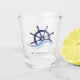 Nautical blue and white bridal shower / bachelorette party shot glass with ship helm and phrase "last sail before the veil". Personalise it with your event details.