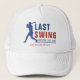 Step up to the plate with this last swing before the ring bachelor party poker hat. Designed in red and blue, with a baseball player, it's perfect for sports fans. Personalize it with the groom's name for a custom keepsake that is sure to be a home run.