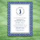 Take one last swing before the ring with this sleek and stylish golf-themed bachelor party invitation—designed for the groom who’s all about the game! Featuring a crisp blue and white colour palette and a bold geometric border, the design showcases a modern silhouette of a golfer mid-swing alongside the playful phrase that sets the tone for an unforgettable pre-wedding celebration. Whether you're planning a relaxed day on the course, a country club dinner, or a full-day event with cocktails and camaraderie, this invitation has room to customise all the essentials—groom's name, tee time, dinner plans, RSVP details, and more. A perfect pick for golf-loving grooms and their crew!