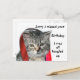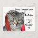 Tabby kitten tangled in ribbon apologised for missing your birthday. She was all tangled up.