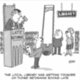 Funny cartoon of a man returning a library book to his local library, only to find that the penalty for lateness has dramatically increased. Gift for a librarian maybe. Illustration shows capital punishment by guillotine. Judge is wearing a black cap in the courtroom. Legal humour.