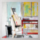 Mixed-media painting. Square size: 50 x 50 cm. Always with me, just a wink to my "formation" of art student in Aix-en-Provence (1982). Chevalet, tabouret, lumière du sud de le France. Studio of the painter, easel and stool, light of the Provence. Just to remember happy days.