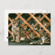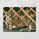 A postcard featuring tabby, tuxedo and grey cats hanging around a lattice fence. The original painting was donated to S.T.A.R.T. II for help they had given me with some outdoor cats by my house. They are a great organisation.