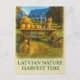 Celebrate the abundance and warmth of autumn with this charming watercolor-style postcard. Featuring a rustic cart loaded with golden pumpkins and colorful gourds, set against a backdrop of a Latvian countryside estate, this image captures the peaceful spirit of the harvest season. Perfect for sending seasonal greetings, sharing rural beauty, or simply enjoying the nostalgic feel of country life.
