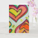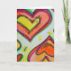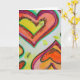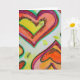 Yellow, peach, and orange hearts form two concentric hearts gliding towards each other tip to tip. Pale yellow colour dots are like confetti between the hearts. The watercolor painting has a light layer of gold and pink on top. Personalise this card with your own text and images using the customise it option. Detail from Inspirational Word "Laugh" painting.