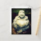 This is a concrete figure of a happy and joyful, round bellied Buddha in a garden setting with greenery bedding and bonsai plants in the background.