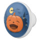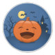 Adorable laughing Halloween pumpkin. A dead tree, a creepy mansion, some bats, and the moon are seen on the background.