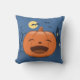 Adorable laughing Halloween pumpkin. A dead tree, a creepy mansion, some bats, and the moon are seen on the background.