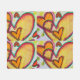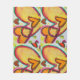 The throw blanket features the inspirational heart art "Laughing Hearts Connect". Peach and orange hearts connect like blowing bubbles drift together. A green outline traces each heart. Pale yellow colour dots are like confetti between the hearts. The watercolor painting has a light layer of gold and pink on top.